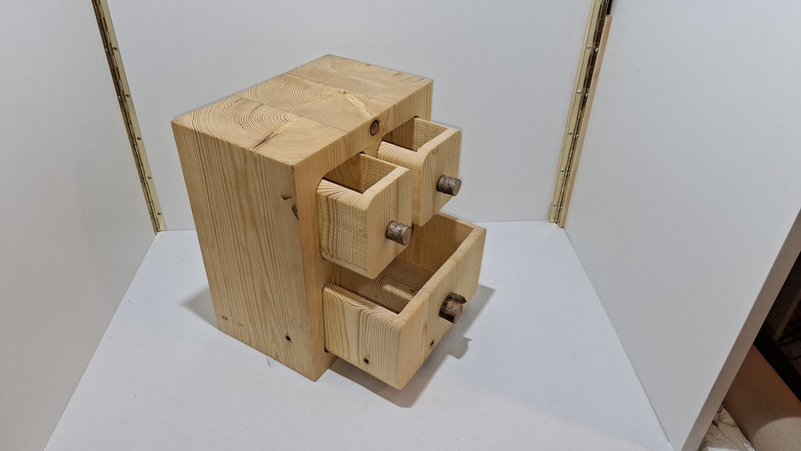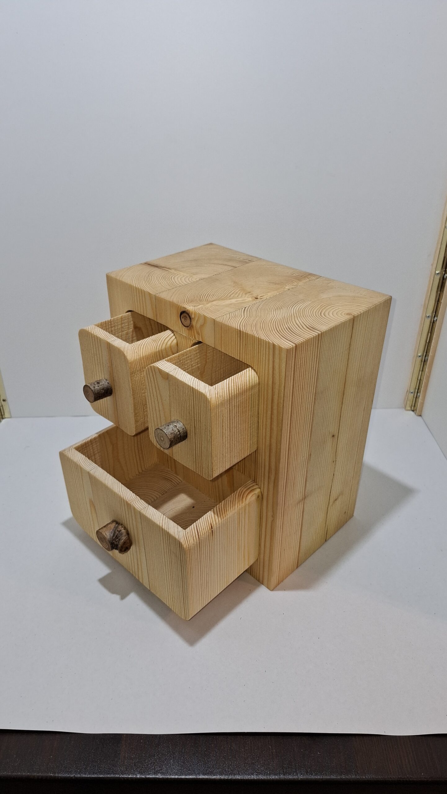 Dieses außergewöhnliche Holzprodukt ist eine handgefertigte Kommode aus einem massiven Baumstamm mit drei geschwungenen Schubladen. Die natürliche Rindenstruktur und die sichtbaren Jahresringe auf der Oberfläche unterstreichen den rustikalen Charme. Quadratische Holzgriffe ergänzen das organische Design und sorgen für einen spannenden Kontrast. Ideal als dekoratives Einzelstück für Wohnräume, Flure oder kreative Arbeitsbereiche. Ein echtes Unikat mit Charakter.