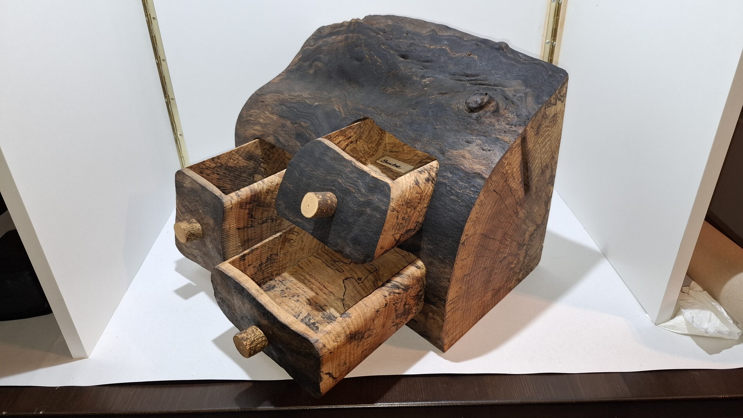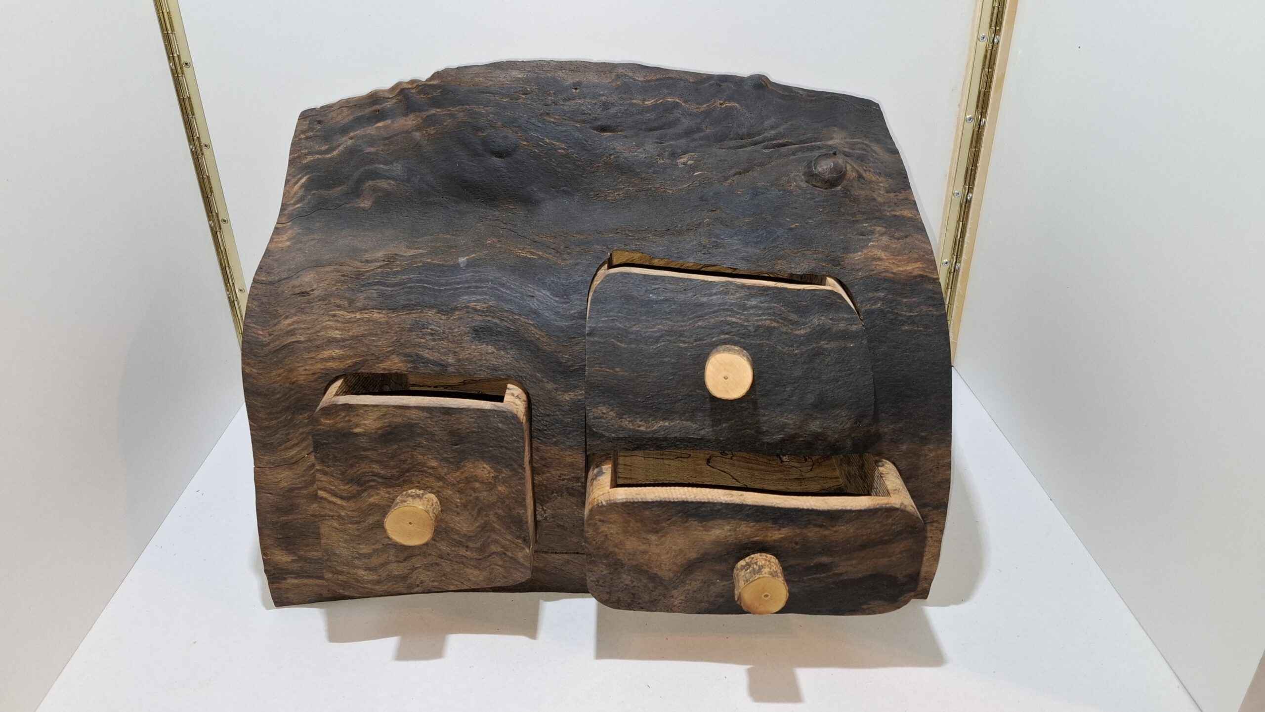 Dieses handgefertigte Holzprodukt ist eine rustikale Mini-Kommode aus einem massiven Baumstammstück. Die Kommode verfügt über zwei geschwungene Schubladen mit dekorativen Keramikknäufen und kombiniert natürliche Holzmaserung mit funktionalem Design. Ideal als dekoratives Aufbewahrungsstück für Kleinigkeiten – z. B. auf dem Schreibtisch, im Flur oder als Schmuckkästchen. Jedes Stück ist ein Unikat.